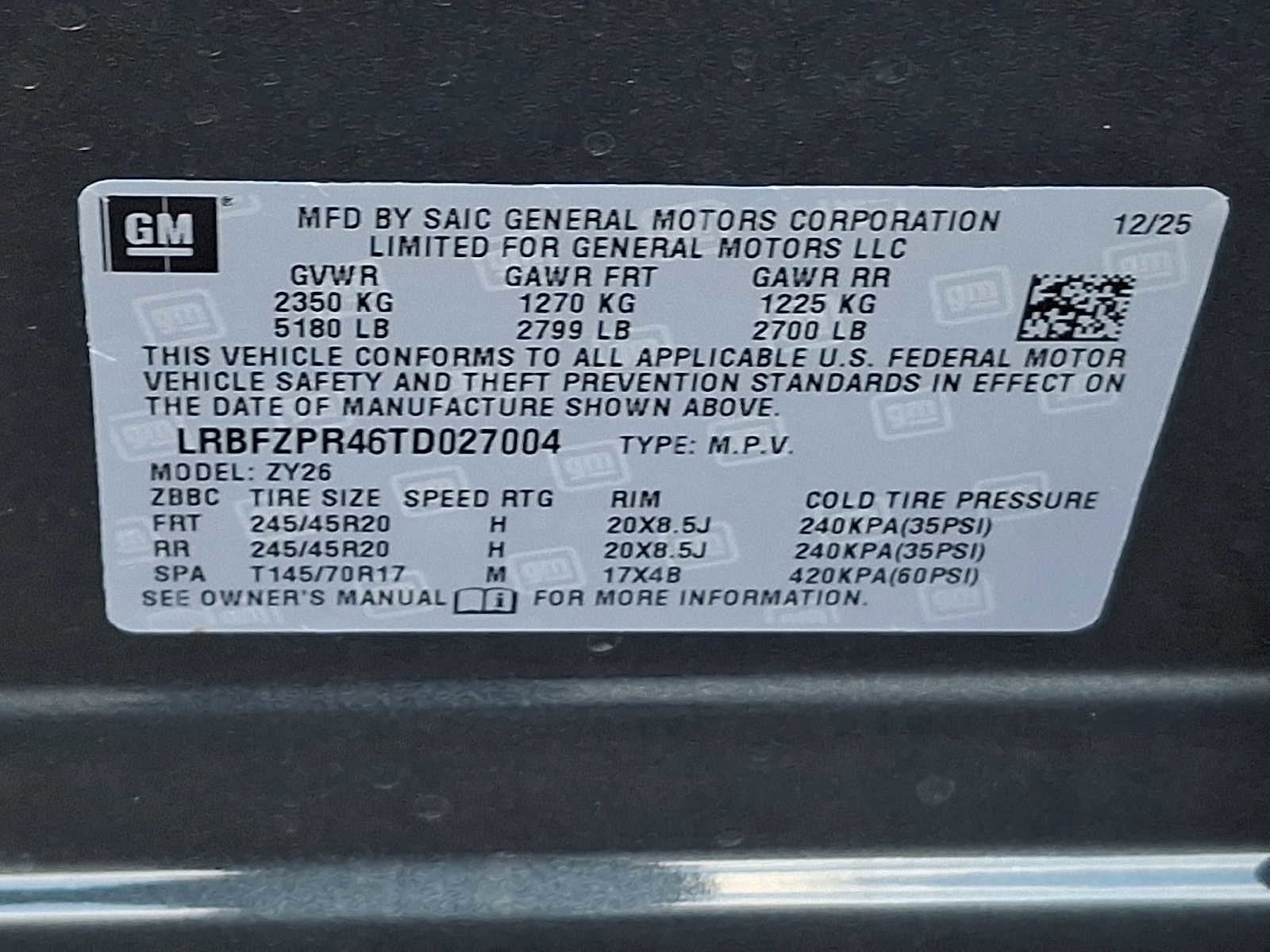 - Tires, P245/45R20 all-season